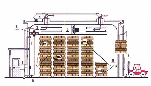 干燥窯是以蒸汽為熱源,濕空氣為介質(zhì),通過控制干燥介質(zhì)的參數(shù)科學(xué)的對木材進行干燥處理。采用蒸汽加熱可實現(xiàn)的窯內(nèi)溫、濕度控制從而獲得干燥質(zhì)量好、含水率均勻的木材干燥產(chǎn)品。