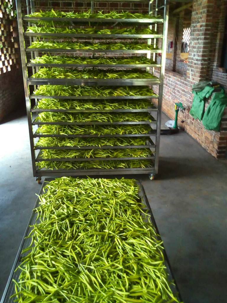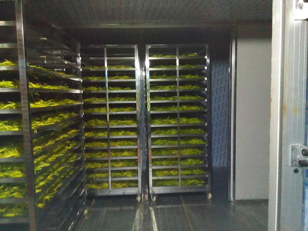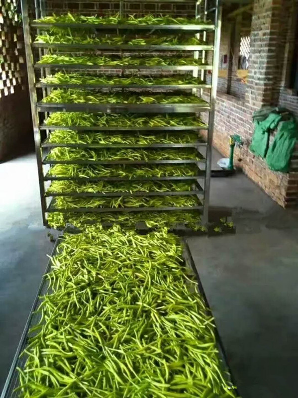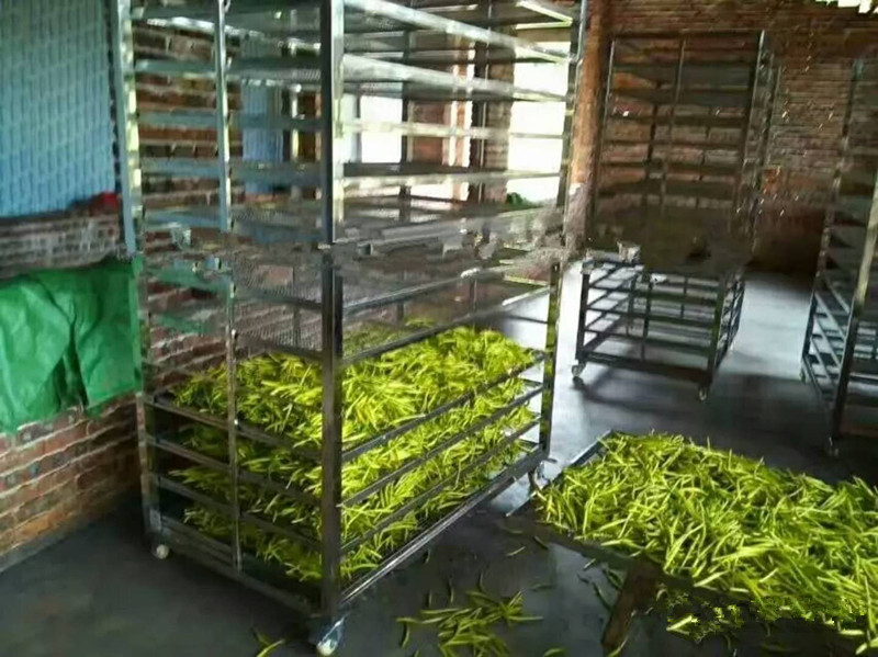 烘干工藝第三步:將高溫蒸煮后的黃花菜均勻鋪放到物料車(chē)內(nèi),注意厚度均勻,每層不超過(guò)3CM。